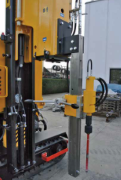 The down the Hole Hammer kit positions the hydraulic rotor between the pile driver hammer and the vertical sliding column and can be used to drill in rock, concrete (without reinforcement) or highly compact conglomerates easily and effectively. When the rotor/Down the Hole Hammer KIT is not used, it can be released from the hammer and left in stand by position, ready for use. This system allows drilling and driving use independently without having to dismantle, offering crew efficiency, safety and reducing the need to dismantle/mount heavy parts when both applications are needed.