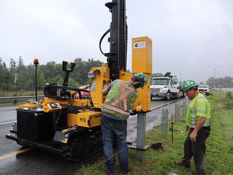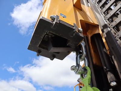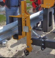 The barrier segments of a steel beam guard rail must first be bolted to together and placed on the ground before handling with the Blad Raiser. The crawler-mounted pile driver equipped with the Blade Raiser then lifts the attached segments, this allows for the mounting position of the exact point and location for the pile to be installed and pounded into the ground and bolted to the rail.